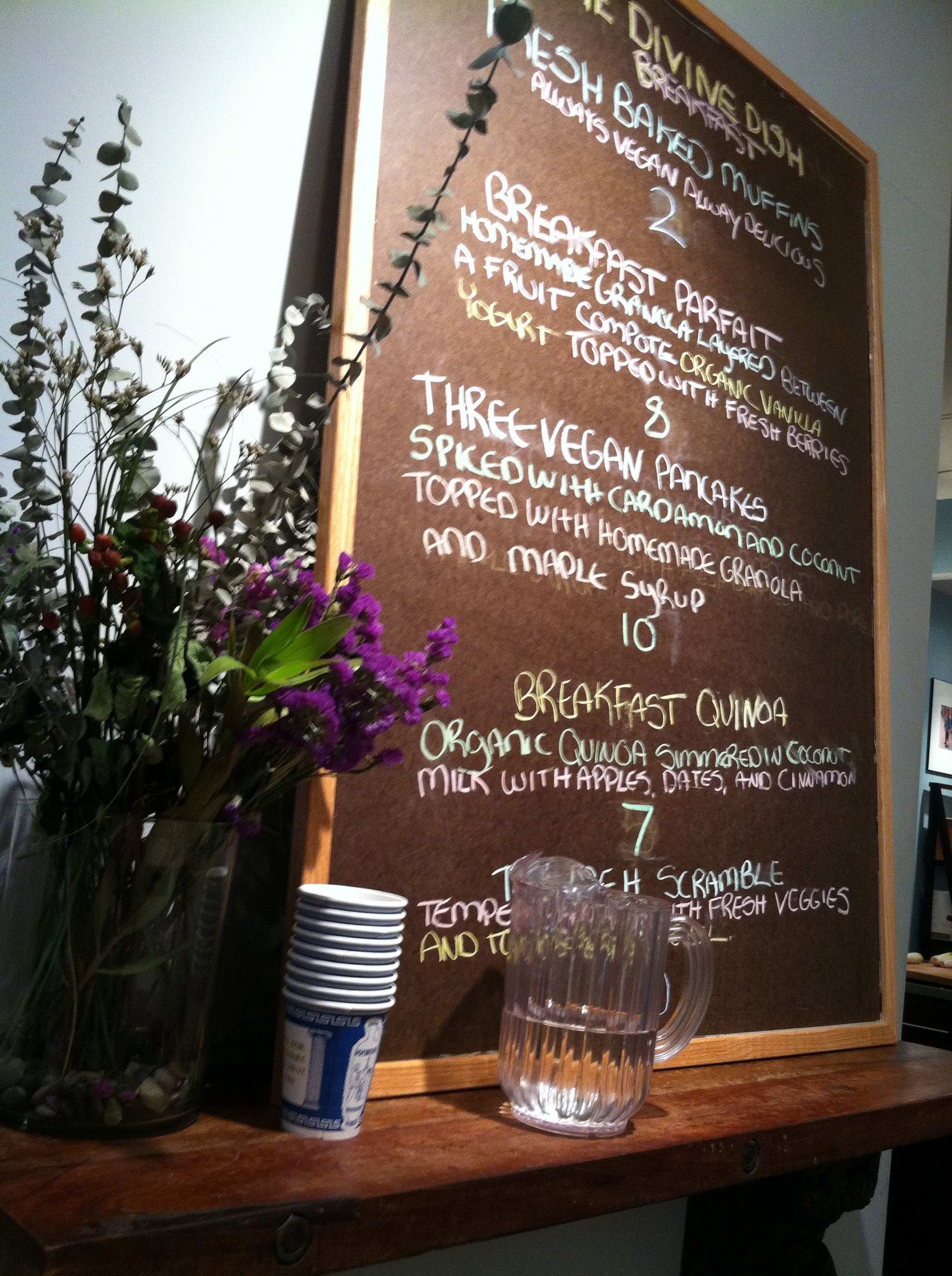 There’s a new yoga studio around the corner from my apartment, Stanton St. Yoga. I took my first class there Tuesday morning and absolutely LOVED it. It’s a good mixture of hatha and vinyasa flow yoga. It you live anywhere near LES you must stop by. The studio has two sisters who are instructors and they are both amazing. It’s also part of a bed and breakfast. The food at the cafe is to die for (see menu above.) After a wonderful practice I had the Breakfast Quinoa. Scrumptious!